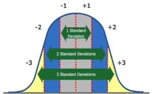 Standard deviation can be presented graphically by a bell curve, which plots the historical distribution of returns in a portfolio. If the curve is perfectly symmetrical as in the bell curve below, standard deviation can help us manage investment risk in a portfolio and forecast a range of probable future returns.